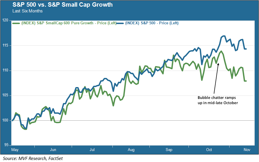 In any event, financial pundits seized onto the “bubble” idea and ran with it. Investors for their part mostly ignored the bubble hype, though, and by the end of the month both the S&P 500 and the S&P Small Cap Growth index (where a number of the up and coming names in the space exist while they try to establish proof of concept) had reached their year-to-date highs. Shortly thereafter, however, the small cap index started to take a pronounced tumble. Yesterday the S&P 500 followed suit, and if today’s market open is any indication of how things end (which may or may not be the case, because even the future six hours ahead is unknowable), the blue chip index will end up down for the week.