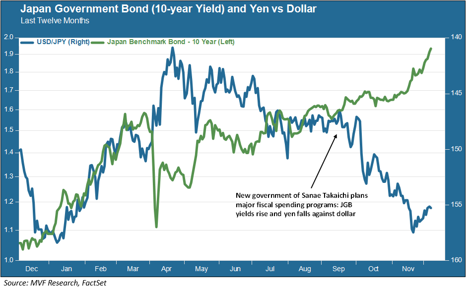 The policy action stems from concerns that the new Takaichi government will be tapping the debt market for sizable supplemental issuances next year in order to fund a massive budgetary program to promote economic growth. Investors have grown wary of longer-dated bonds recently, with a collective holding of breath and then a measure of relief when a 20-year JGB auction this week managed to scrape out enough demand to cover the issue. Observers worry that the government’s plans will prove too ambitious for the market to swallow, particularly if the size of the government’s budget necessitates going back to those shaky longer maturities. The same concerns have been behind the recent pronounced weakness in the yen against other major currencies.