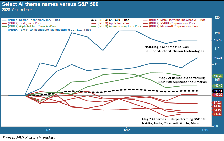 Since we are now sixteen days into Year 2026 of the Common Era, it is once again time for everyone in the financial field to make bold pronouncements about the Great Rotation that is to January what the Great Pumpkin of Peanuts fame is to October (i.e., the wild imagining of an impressionable mind). It’s true that small cap and value stocks have done comparatively well in this year’s early days. And as of this morning five of the fabled “Magnificent Seven” stocks that for the past three years have served as an easy market shorthand for “AI leaders” are trailing the S&P 500. But the way we see it, this is less about the eclipse of the AI narrative, which shows no signs of going away as a core component of US economic growth, than it is about the AI story getting more complicated, with more careful parsing of where different companies actually stack up in the narrative. We’ll introduce two names in the chart below that are not part of the Mag Seven but are very much at the center of all things AI: Taiwan Semiconductor (TSMC) and Micron Technologies.