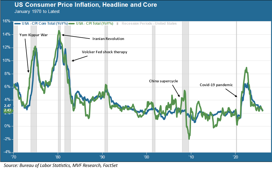As a refresher from last week’s commentary: approximately 20 percent of the world’s oil exports pass through the Strait of Hormuz, a sea lane with a span of roughly 35 miles bounded on three sides by Iran and one side by Oman. How much longer will this critical bottleneck remain shut? Given the volatile state of play in this unfolding crisis, who knows? Maybe tensions will be resolved by the time you are reading this piece on Friday afternoon. Maybe it will be out of service for weeks or even months to come. In a column this week on Substack the economist Paul Krugman noted that the “hit to oil prices will if anything be bigger than earlier crises” (Krugman’s own words) if the Strait were to remain closed on an ongoing basis. With that in mind, it is worth spending some time looking at what those previous crises meant in terms of inflation – both the core number which is the main object of focus for the Fed, and the headline number which actually takes into account the money you and I spend every week on groceries and gas. Forget that February CPI report, and prepare for something different in March and April.